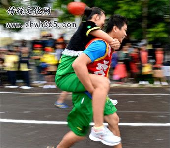 在昌江黎族自治縣一帶流行。每年的農(nóng)歷十五前后,孩子們就聚居在一空曠地,舉行村與村之間比賽??筛鶕?jù)人數(shù)來分組,每組2人(一男一女),每次由兩組進(jìn)行,實(shí)行淘汰制,男背著女或女背著男亦可,與對方互相碰撞,男女通過踢、拉、推等動作,千方百計(jì)地把對方背著的人或拉下,或把兩人分開,或倒地。在場觀看的人興高采烈,笑聲不斷,其樂無窮。