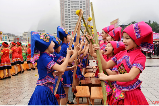 都安縣500名群眾歡聚一堂,打起扁擔(dān),喜迎“三月三”。
