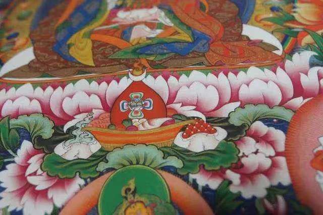 900多年前流傳于衛(wèi)藏地區(qū)(現(xiàn)山南)的齊烏崗派唐卡,由雅堆·齊烏崗巴創(chuàng)立,與嘎瑪嘎赤畫派、勉塘畫派、欽孜畫派、埃赤畫派并稱“唐卡五大畫派”。齊烏崗派特點(diǎn)為人物體形飽滿、生動(dòng)細(xì)膩,色彩以棗紅、橘紅暖色系為主;中央的主尊突出,背景多用卷草紋作為裝飾。特別是,齊烏崗派唐卡的佛像肩膀旁都有象征翅膀的“三角”,源于創(chuàng)始人齊烏崗巴行動(dòng)靈敏,亦被稱作“齊烏派”。