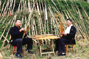 隨著日子的臨近,有些村寨的蘆笙手干脆包米包菜到莫師傅家守候和督促。大量訂戶的到來使莫師傅的工作室變得擁擠不堪。莫厭學(xué)、莫里學(xué)兩兄弟干脆把制作蘆笙的工作室搬到室外,把最近2個月來制作的1077把蘆笙也搬到室外逐一進(jìn)行檢修和校音。
