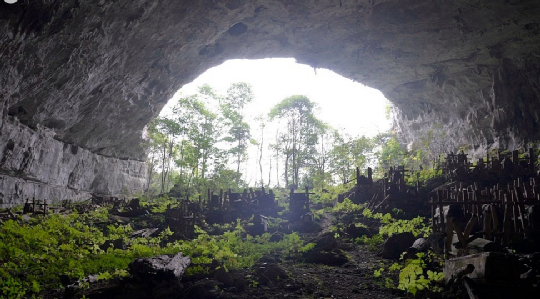 果里巖洞葬位于貴州龍里縣擺省鄉(xiāng)果里村東1公里煤洞坡的洞穴中,地處巖溶山原,峰叢林立,喬灌間雜。該洞在山頂下四十米處呈南北向橫穿山體,長(zhǎng)580米,寬為38—65米,高為21—50米,有兩個(gè)入口;北面入口,寬54米,高21米,;南面入口,寬35米,高45米,有三道石砌墻垣。洞中地勢(shì)內(nèi)斜平緩,洞內(nèi)干燥,能見(jiàn)度好,入口處地勢(shì)外斜。據(jù)查,果里的苗族于明朝初期從貴陽(yáng)遷徙而來(lái)。從遷徙之初至清末,他們均習(xí)慣將亡者殮于棺木集中存放在洞穴之內(nèi)。在洞穴北面入口3000平方米的范圍內(nèi)現(xiàn)存完好的棺木有192具,腐朽散落及其它原因損毀的約200余具。棺木材質(zhì)為杉木。棺木有平板平頭和鼓型雄頭之分,其大小因亡者的體型而定。平板平頭型棺木制作粗糙,長(zhǎng)1.45—2.23米,寬0.46—0.75米,高0.46——0.9米;鼓型雄頭棺木多為杉木本色,長(zhǎng)1.5—2.23米,寬0.48—0.8米,高0.5—0.9米。棺木一律頭向北面入口,均固定于兩個(gè)或三個(gè)“井”字架上;三個(gè)“井”字架表明亡者為男性,兩個(gè)“井”字架的為女性。棺內(nèi)亡者頭靠凹型木枕。平板平頭棺為明代,鼓型雄頭棺為清代。