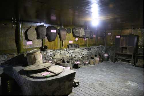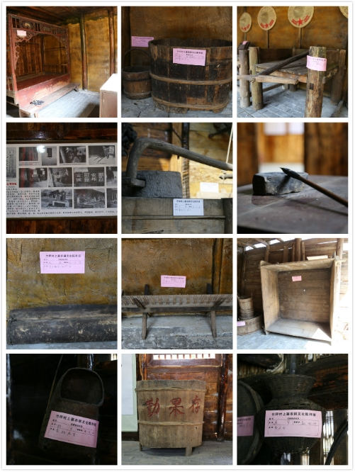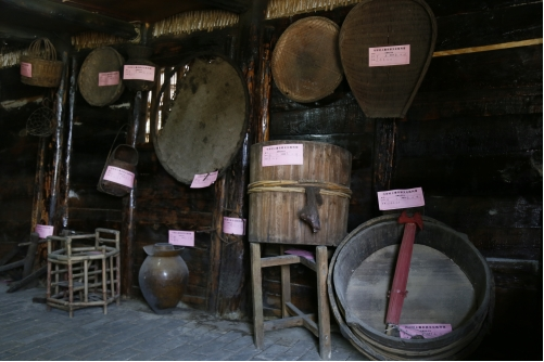“農(nóng)耕文化陳列館”是由兩棟傳統(tǒng)的木質(zhì)民房改建,從大門進(jìn)來(lái),門的兩邊放置有農(nóng)具,右側(cè)一個(gè)是存儲(chǔ)糧食的倉(cāng)庫(kù),沿著倉(cāng)庫(kù)邊上的石階往上走,從小門進(jìn)去,大大小小的簸箕、飯甑、貓籮、魚(yú)籮等農(nóng)具應(yīng)有盡有。