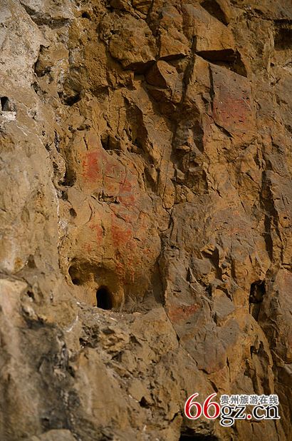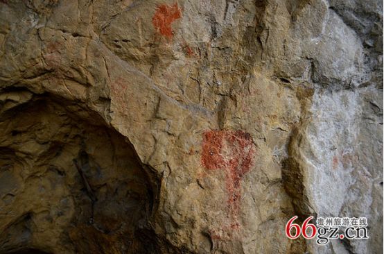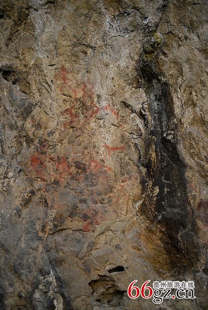 據(jù)資料載,金山洞古代崖畫以赭色涂繪人、馬、狗等等,隱約可見形態(tài)各異的大小圖像二三十個(gè)。人物多作行走狀,亦有雙手高舉者,似乎在祈禱。從其畫風(fēng)觀察,與相距不遠(yuǎn)的省級(jí)文物保護(hù)單位--長順龍家院崖畫十分相似。