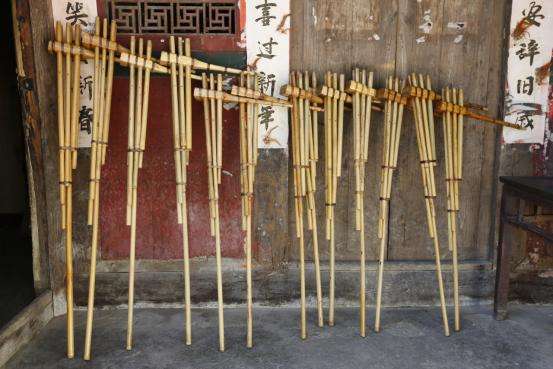 他想去想來,在家后面有一片竹林,他就用竹子一管一節(jié),用綿條做成簧片,裝在竹管里面吹發(fā)出聲音,每一根竹管發(fā)出的聲音都不同。他就發(fā)給這些兄弟每人一截,二兄弟比老三的長一點(diǎn),老三比老四的長一點(diǎn),老四比老五的長,老六就是最短的。大家晚上回來,大哥就說,你們干活真的挺賣力,每天都不知道怎么請你們吃飯,所以我想了一個(gè)辦法,以后每天聽到我發(fā)出的聲音,說明我已經(jīng)做好飯可以吃了,你們就回來互相打信號。大家都說,大哥是一個(gè)聰明人,這個(gè)辦法很好。