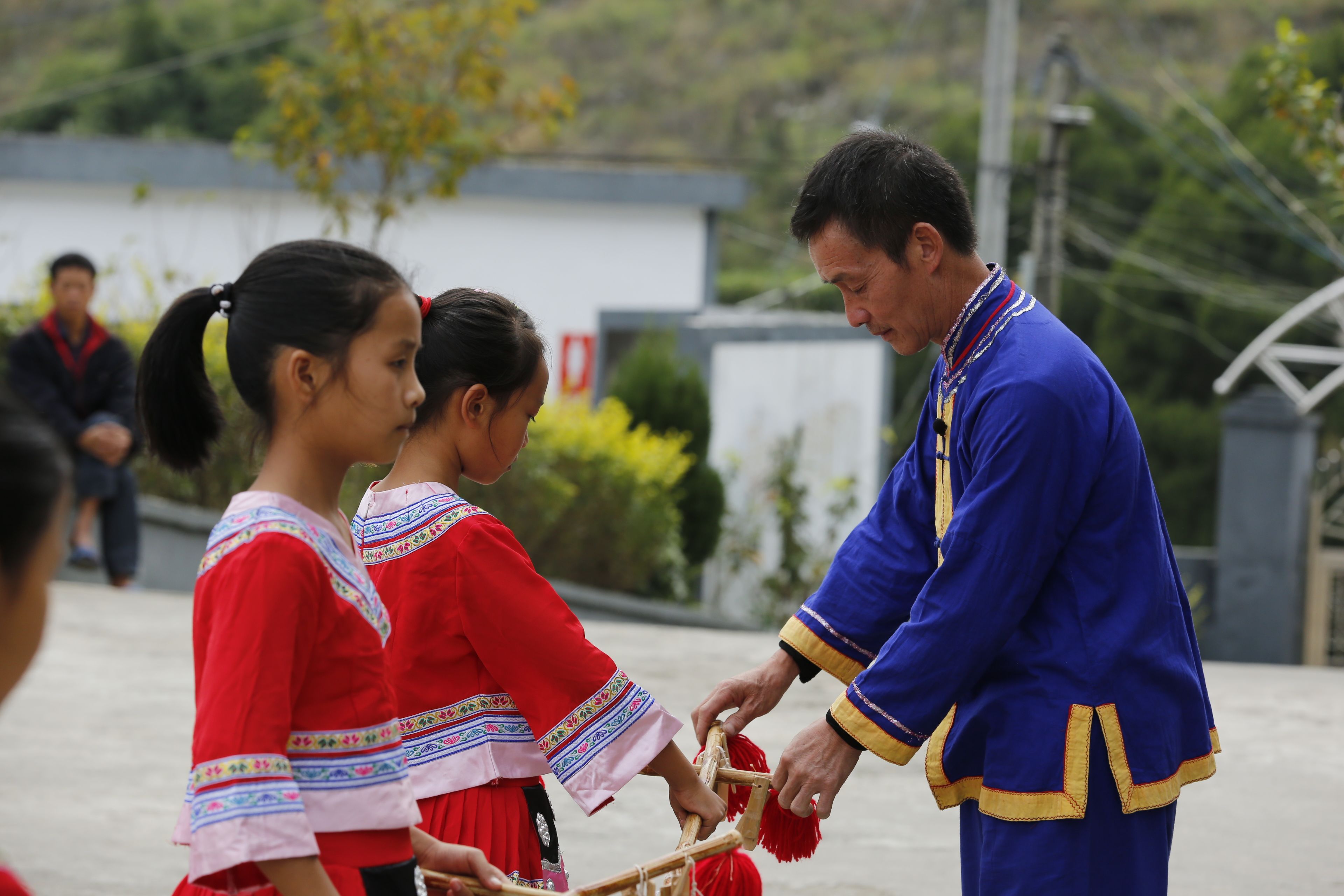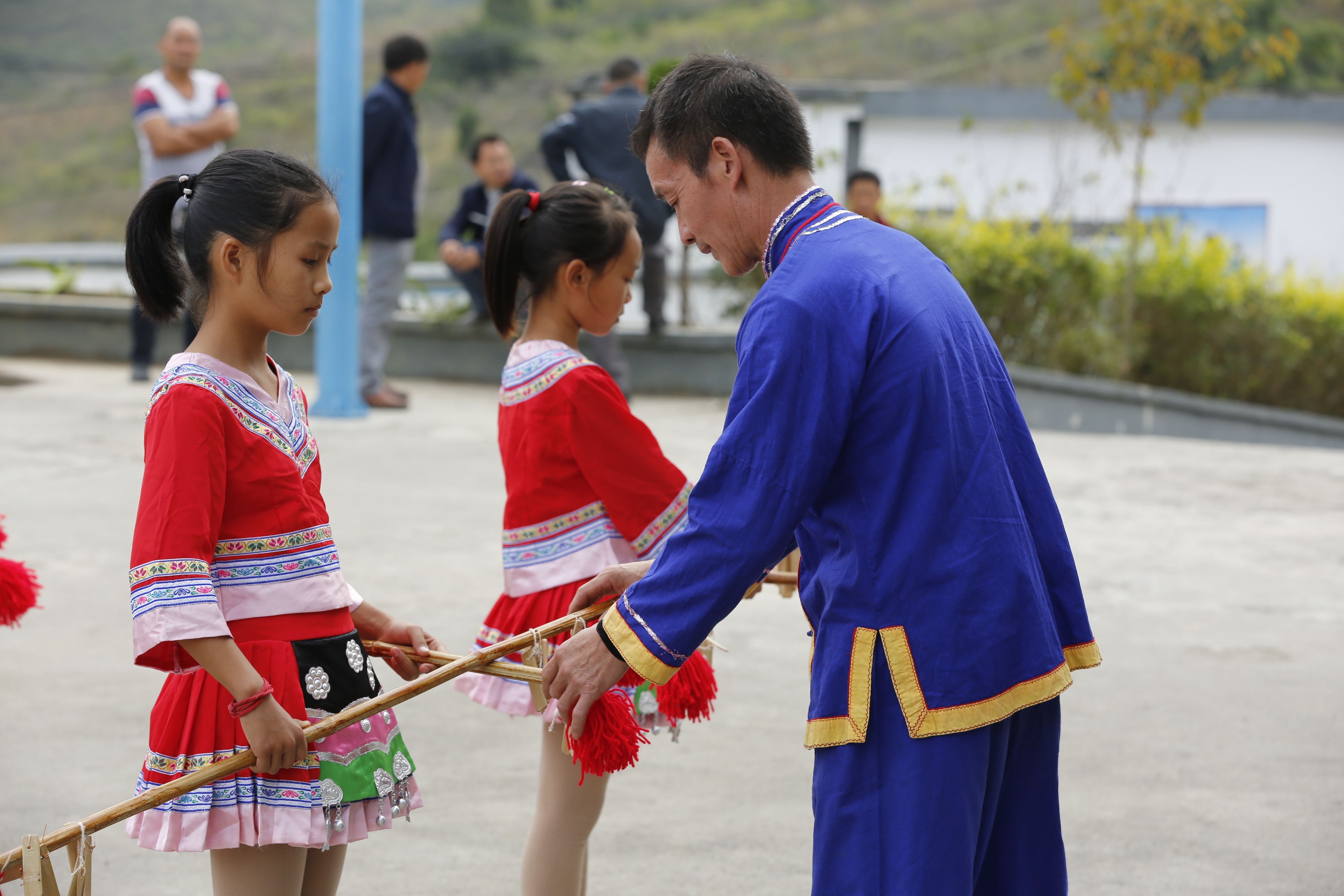 圖片名稱(chēng):貴州貴陽(yáng)苗族長(zhǎng)竹舞傳承人教孩子們持竿手法