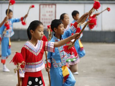 貴州貴陽(yáng)苗族長(zhǎng)竹舞傳承人教孩...