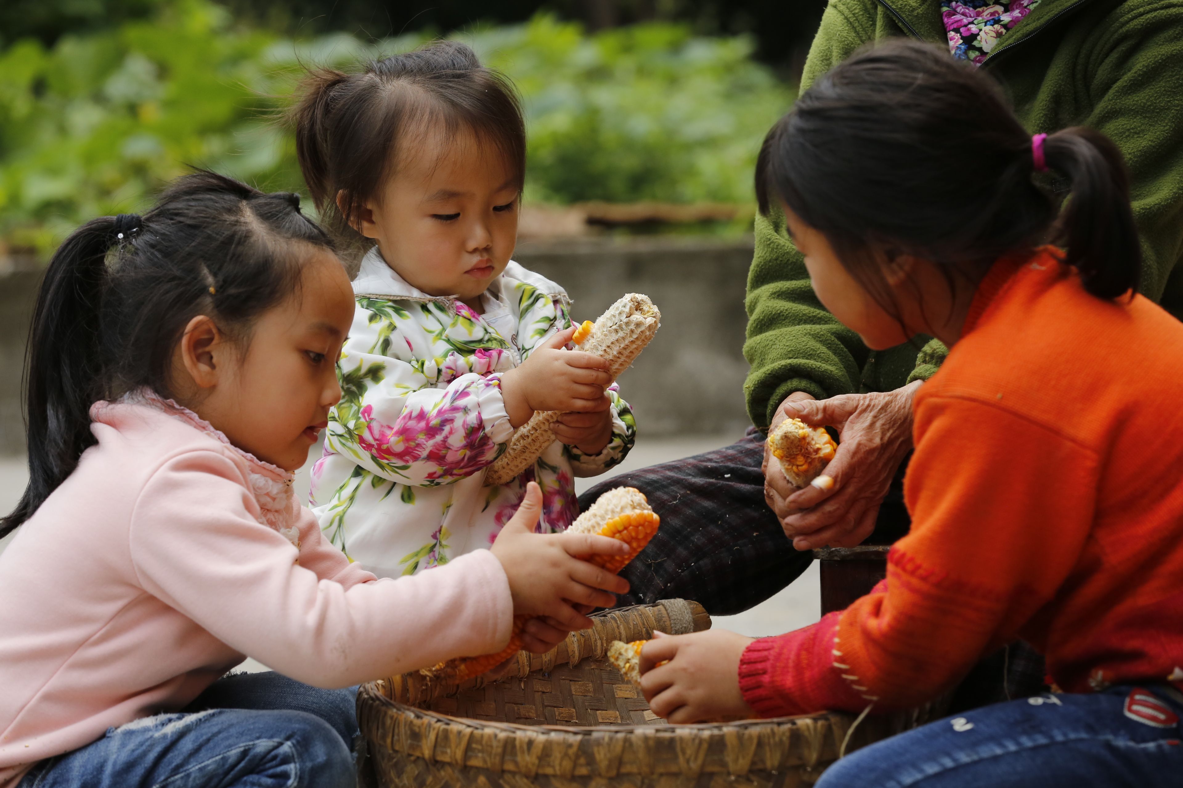 苗族日常生活-老年人與兒童剝玉米2
